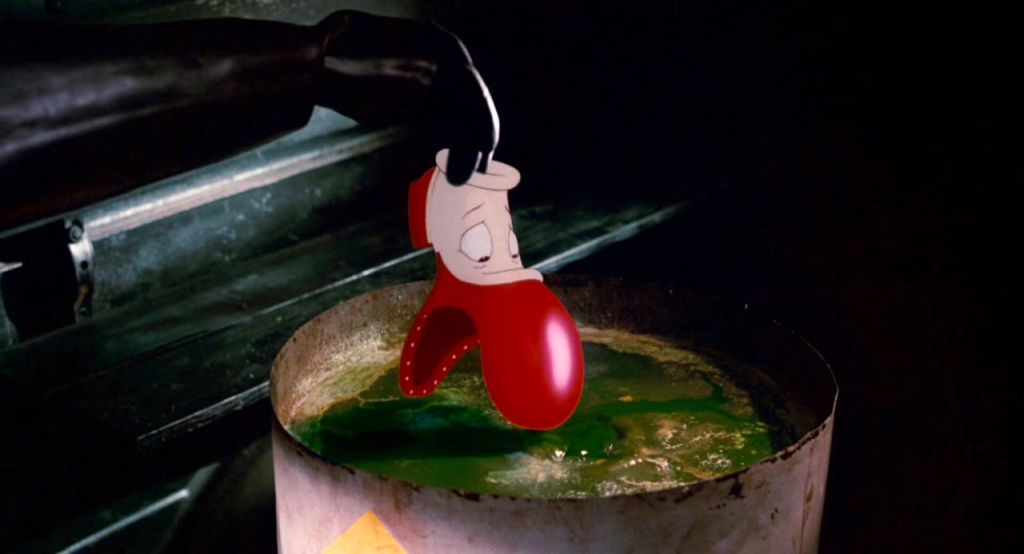 The next morning, Acme is found dead, crushed by a safe in his factory. Evidence at the scene implicates Roger Rabbit, who quickly becomes the prime suspect in Acme’s murder. The case draws the attention of Judge Doom, the sinister judge who presides over Toontown. Doom is notorious for his ruthless methods and his invention, “the Dip,” a mixture of turpentine, acetone, and benzene, capable of killing Toons, who are otherwise believed to be indestructible.
